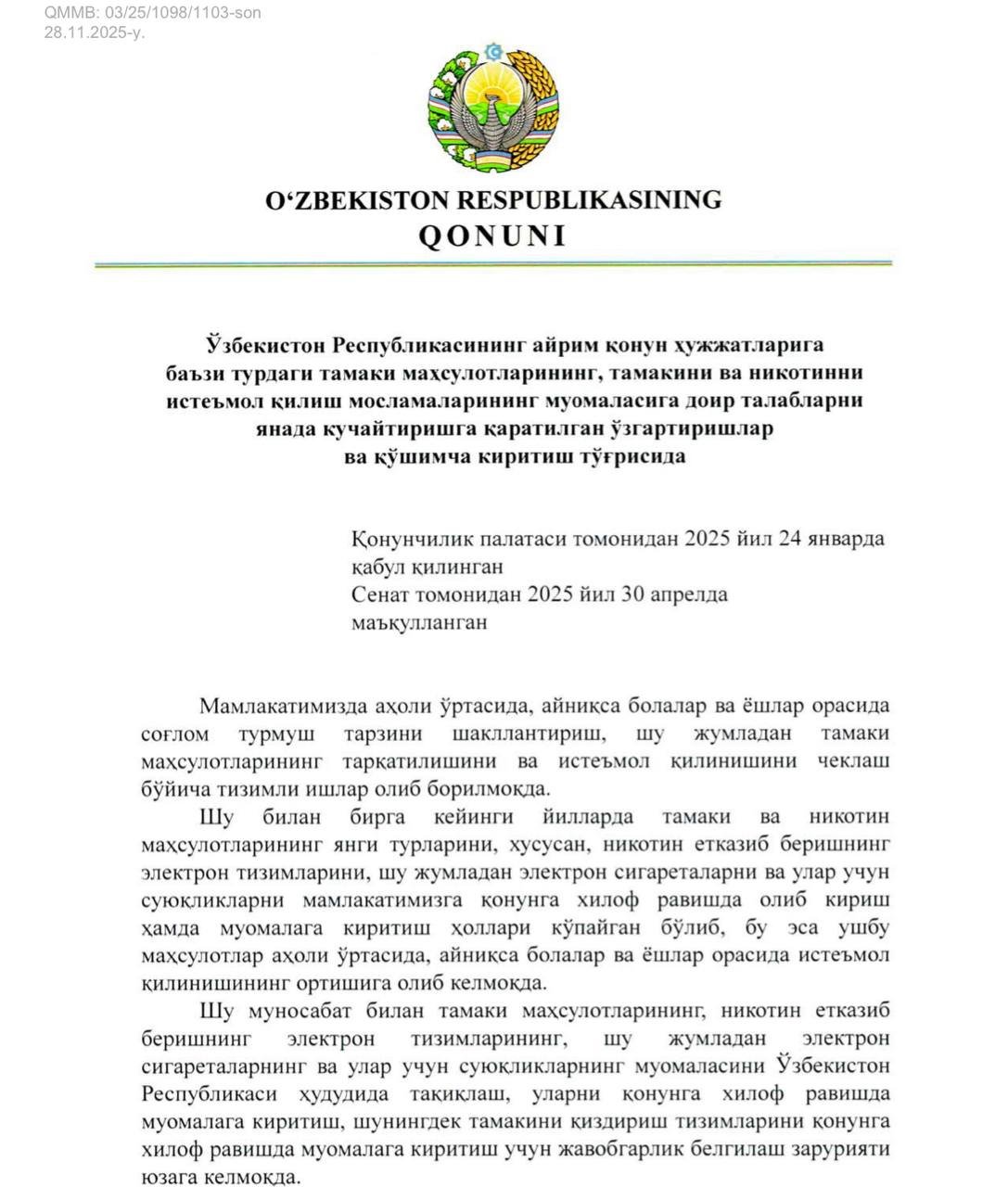 Президент Узбекистана Шавкат Мирзиёев подписал поправки в законодательство, которые вводят в стране полный запрет на электронные сигареты и другие системы доставки никотина. Новые нормы стали частью закона «Об ограничении распространения и употребления алкогольной и табачной продукции».