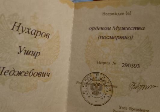 Старший стрелок штурмовой роты, уроженец Кыргызстана Ушир Леджебович Нухаров, погибший при выполнении боевого задания, удостоен государственной награды посмертно. Указом Президента Российской Федерации от 6 декабря 2025 года он награждён орденом Мужества.