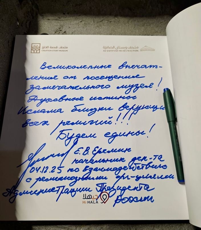 В музее, где с помощью новейших технологий представлена история человечества в контексте коранической традиции, российскую делегацию встретили представители руководства учреждения и известных саудовских семей, ведущих свою родословную от сподвижников Пророка Мухаммада (мир ему и благословение). По окончании осмотра Евгений Еремин оставил памятную запись в книге почётных гостей.