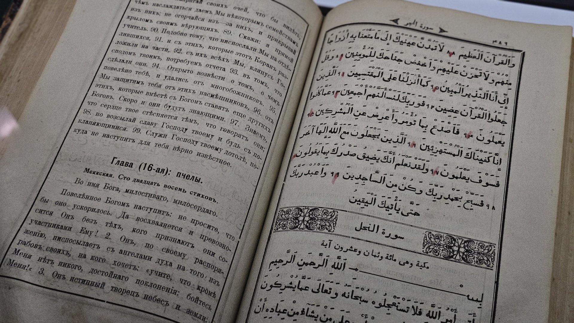 Казанский перевод КоранаТакже среди экспонатов — предметы, иллюстрирующие пребывание поэта в Казани в 1833 году. Это и переводы Корана на русский язык, выполненные в XIX–XX веках, и Коран на арабском языке, напечатанный в Азиатской типографии Казанского университета в 1820 году.