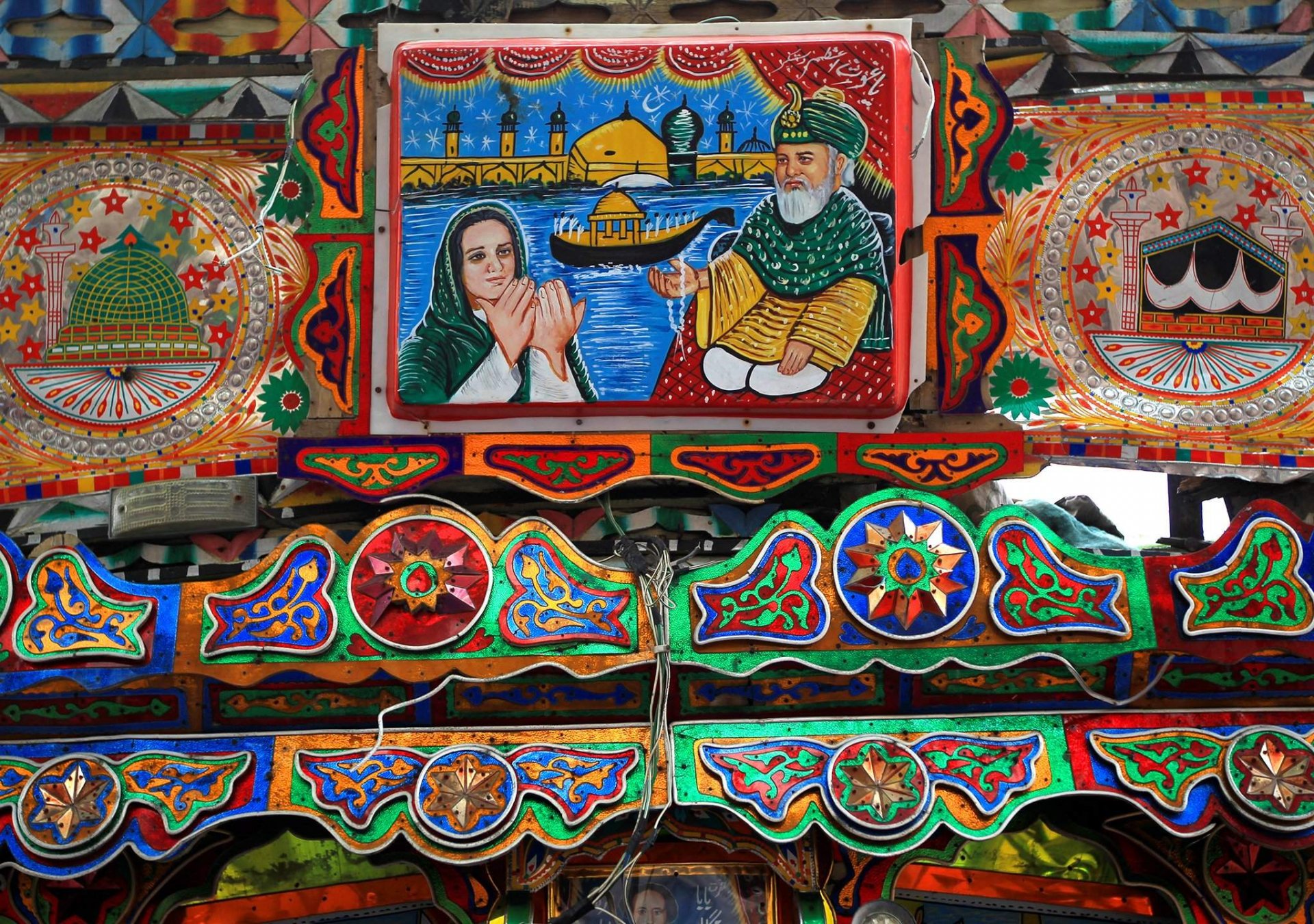 Особое место в росписи занимают пейзажи — горные долины, воспоминания о родных местах, которые водитель покинул, отправляясь в долгую дорогу. Через эти изображения проходит тоска по дому и любовь к красоте пакистанской земли. Завершают композицию шамаили — поэтические строки и цитаты из Корана, короткие молитвы о безопасности в пути, пожелания удачи и благословения, которые, как верит водитель, будут охранять его в дороге.