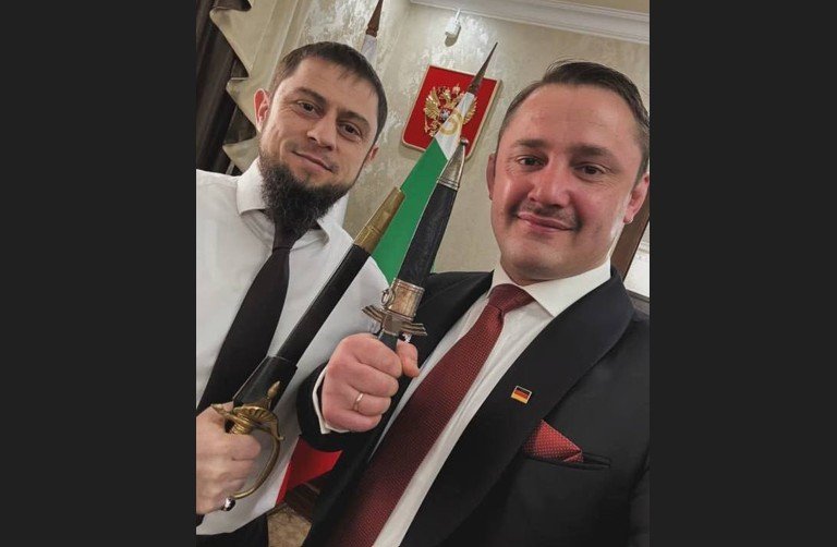 Член ультраправой партии «Альтернатива для Германии» (АдГ) Ноа Кригер (Мурад Дадаев), находящийся с двухнедельным визитом в Чечне, преподнес местным чиновникам в подарок трофейный кортик Люфтваффе времен Второй мировой войны.